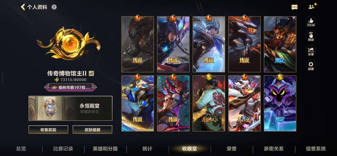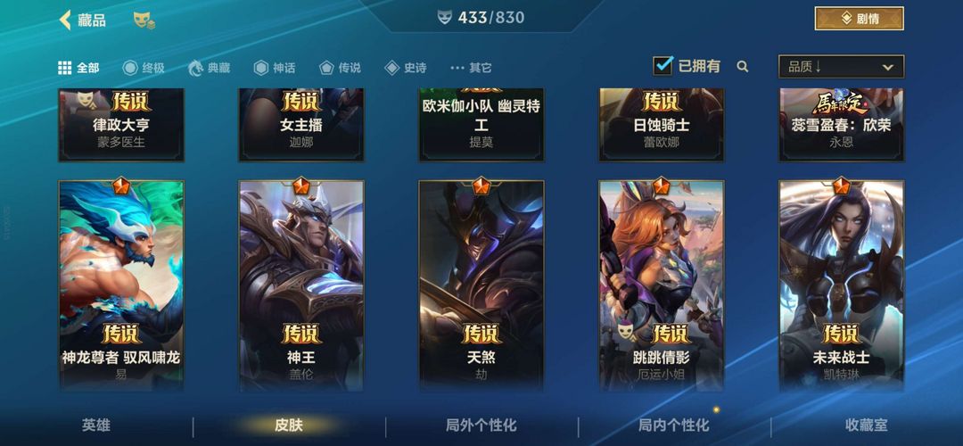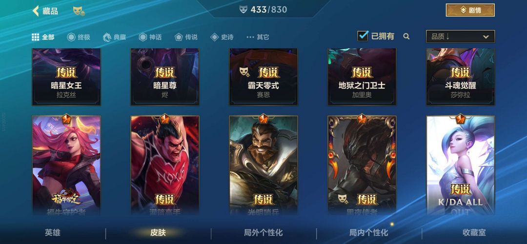 安卓V区 王者段位可排434个皮肤!5神话40传说限定!龙虾 想玩的皮肤基本都有!冲冲冲
