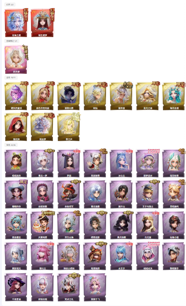 万氪✨满图鉴✨3红11金32紫✨新皮星渊法则✨非遗皮沧海之遗✨剑仙✨莲华渡✨瑶台梦✨春之声✨兔宝
