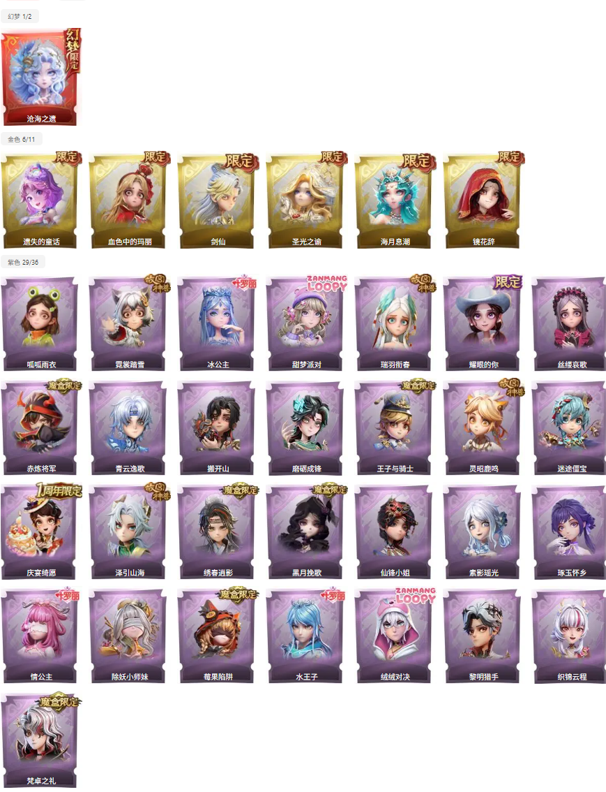 满图鉴✨晶澜灵翼✨1红6金29紫✨非遗皮沧海之遗✨剑仙✨血色玛丽✨赤炼将军✨泽引山海✨绣春逍影✨圣光