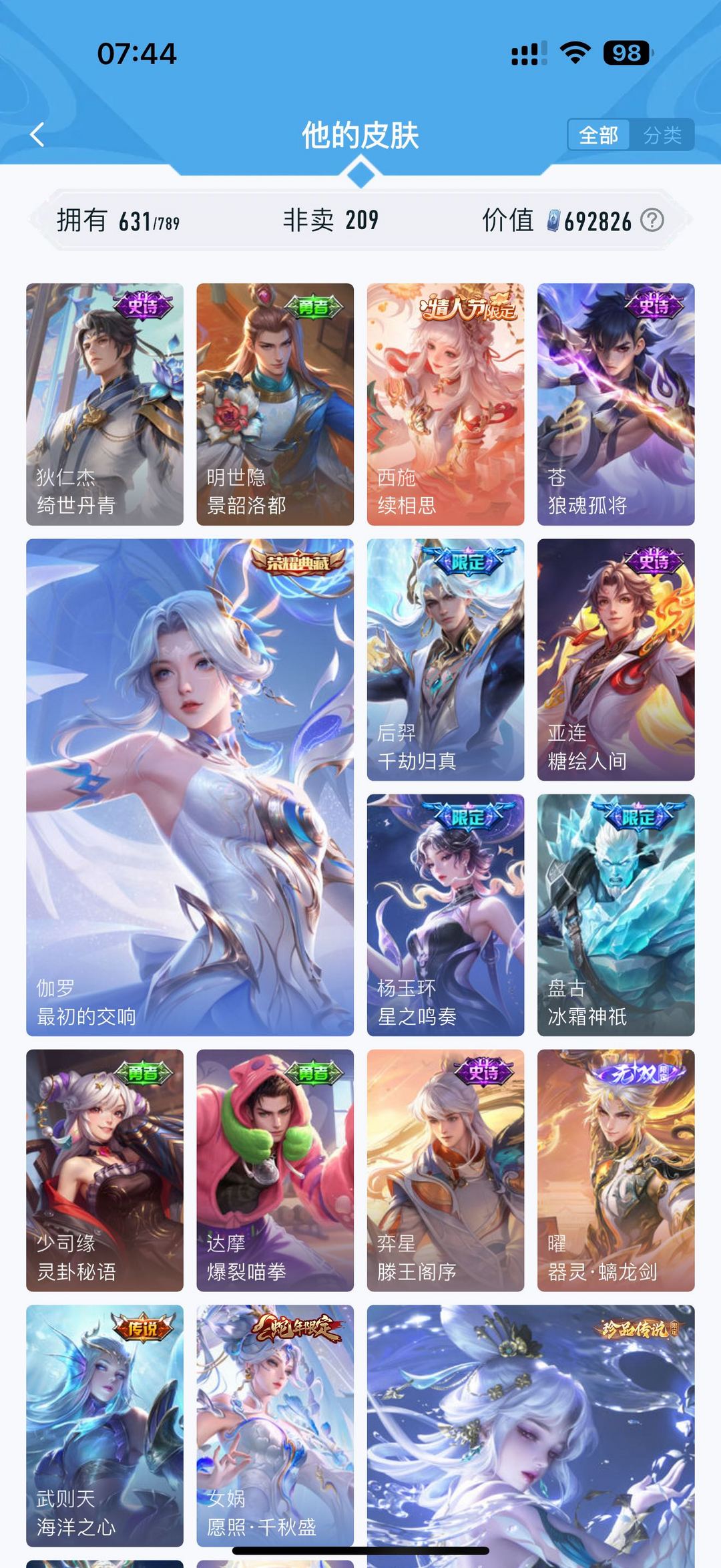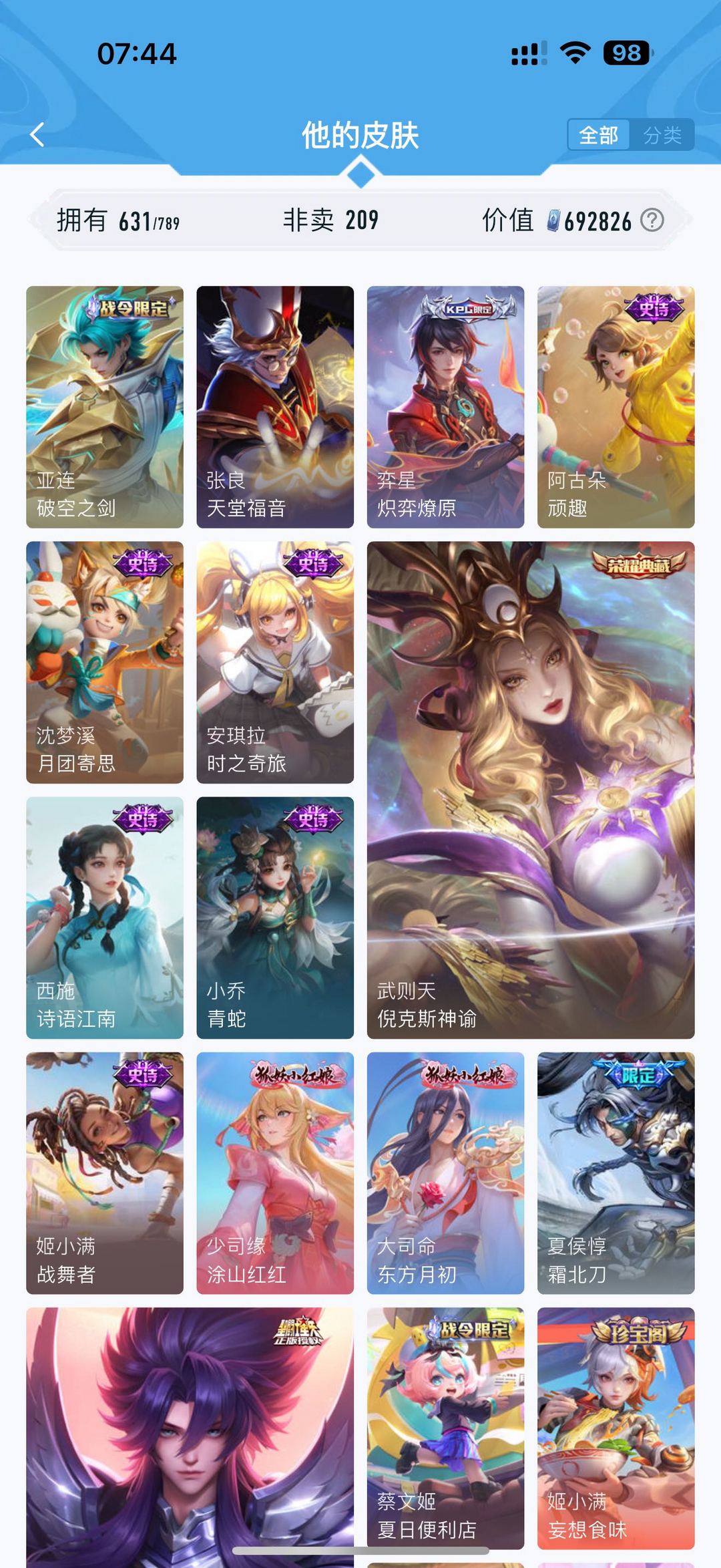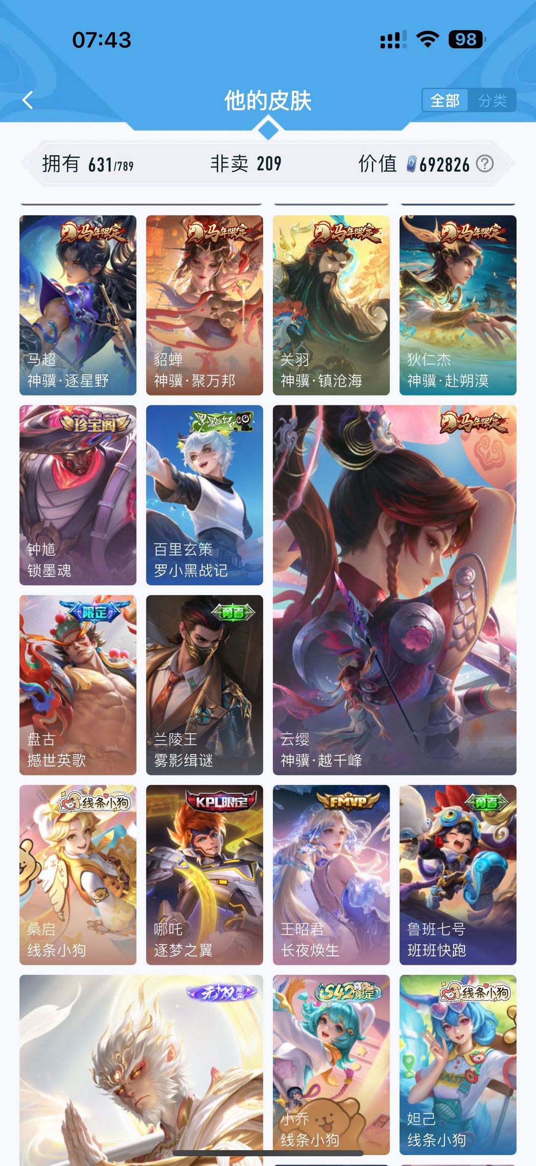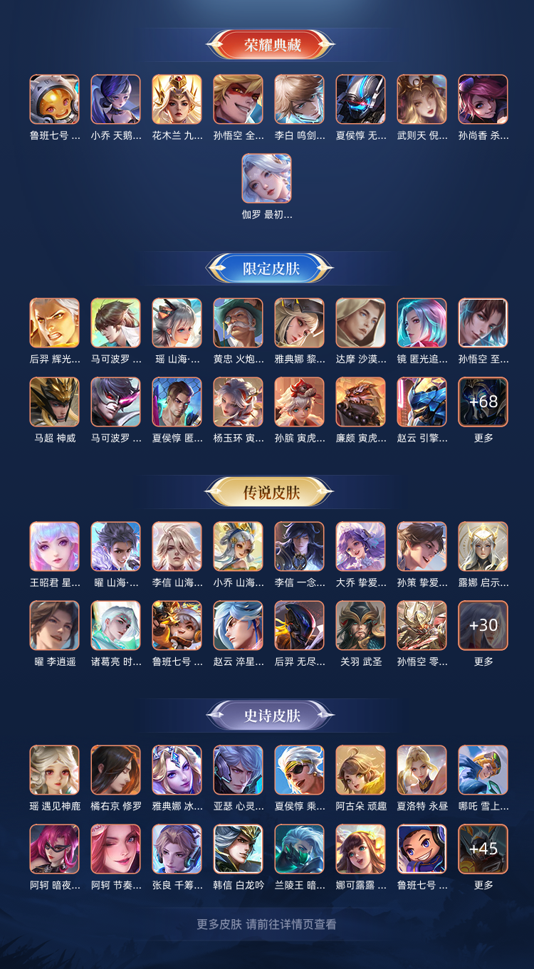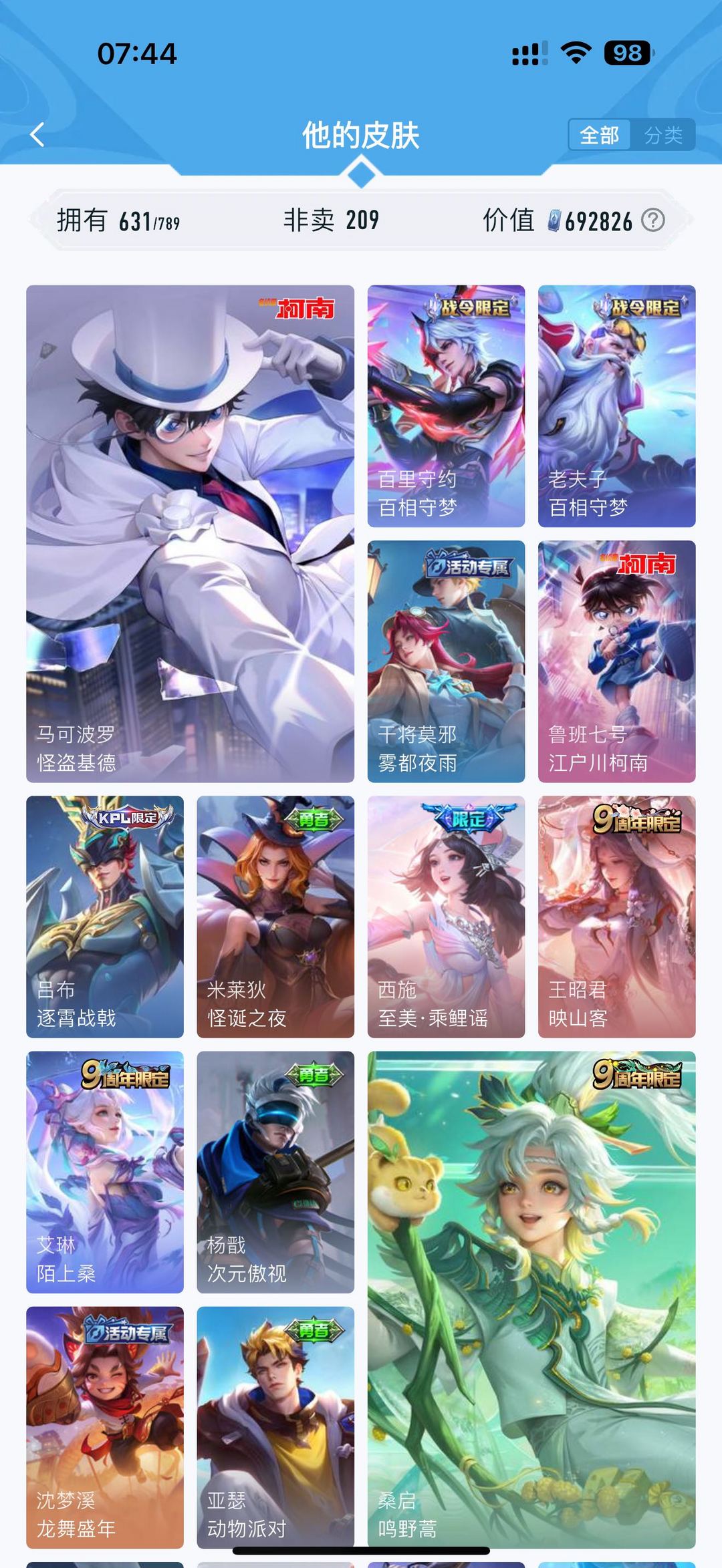 v10☆631皮肤☆9典藏☆6无双皮肤☆猴子满皮☆怪盗基德☆梅西☆九尾☆五虎五岳五圣