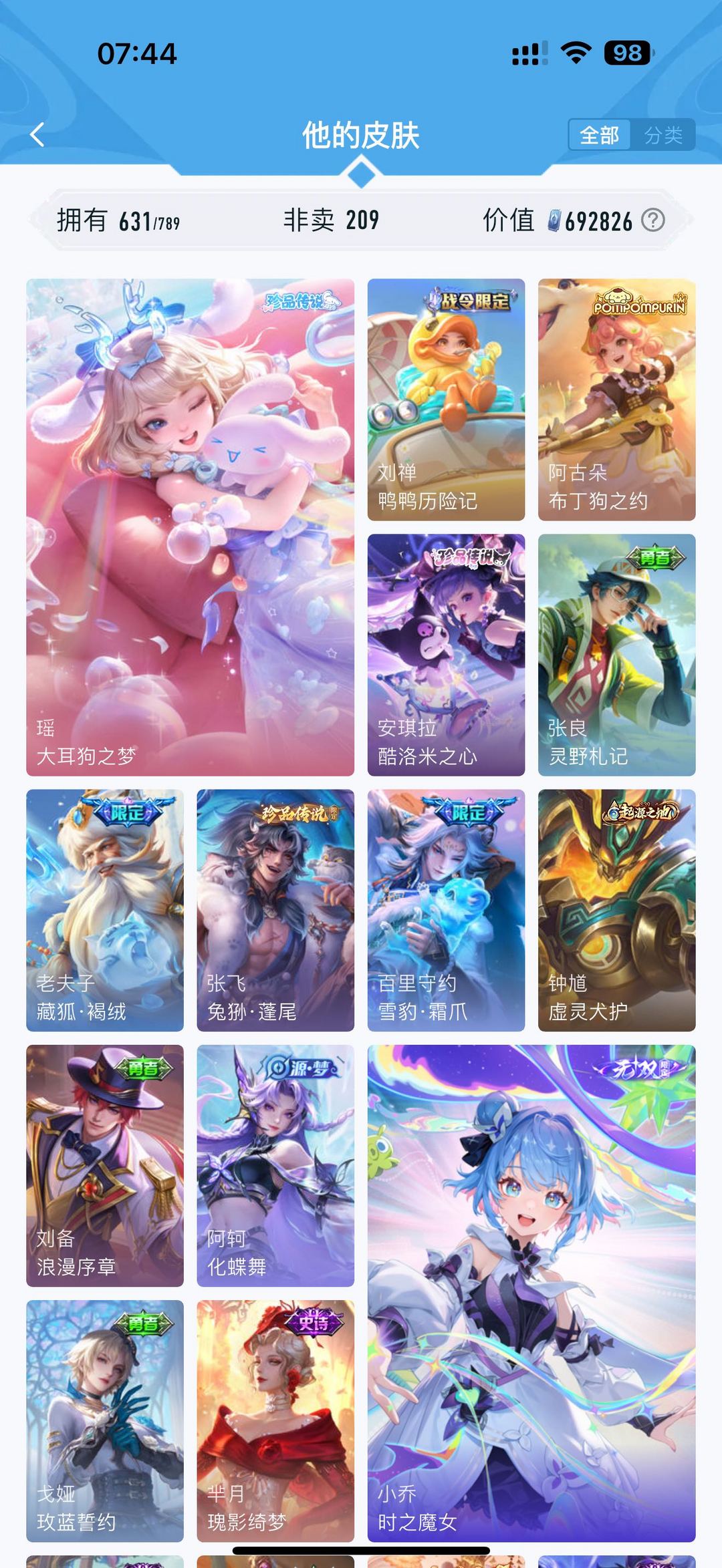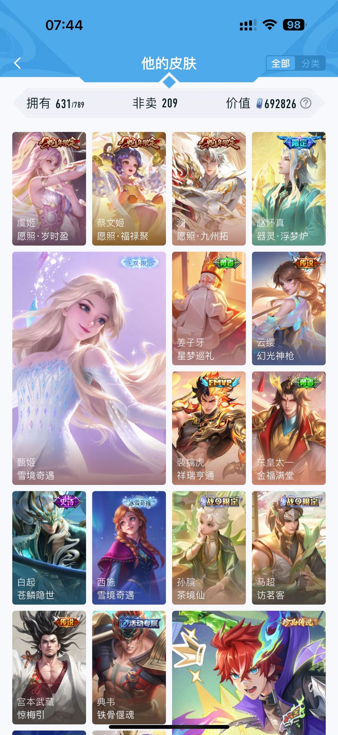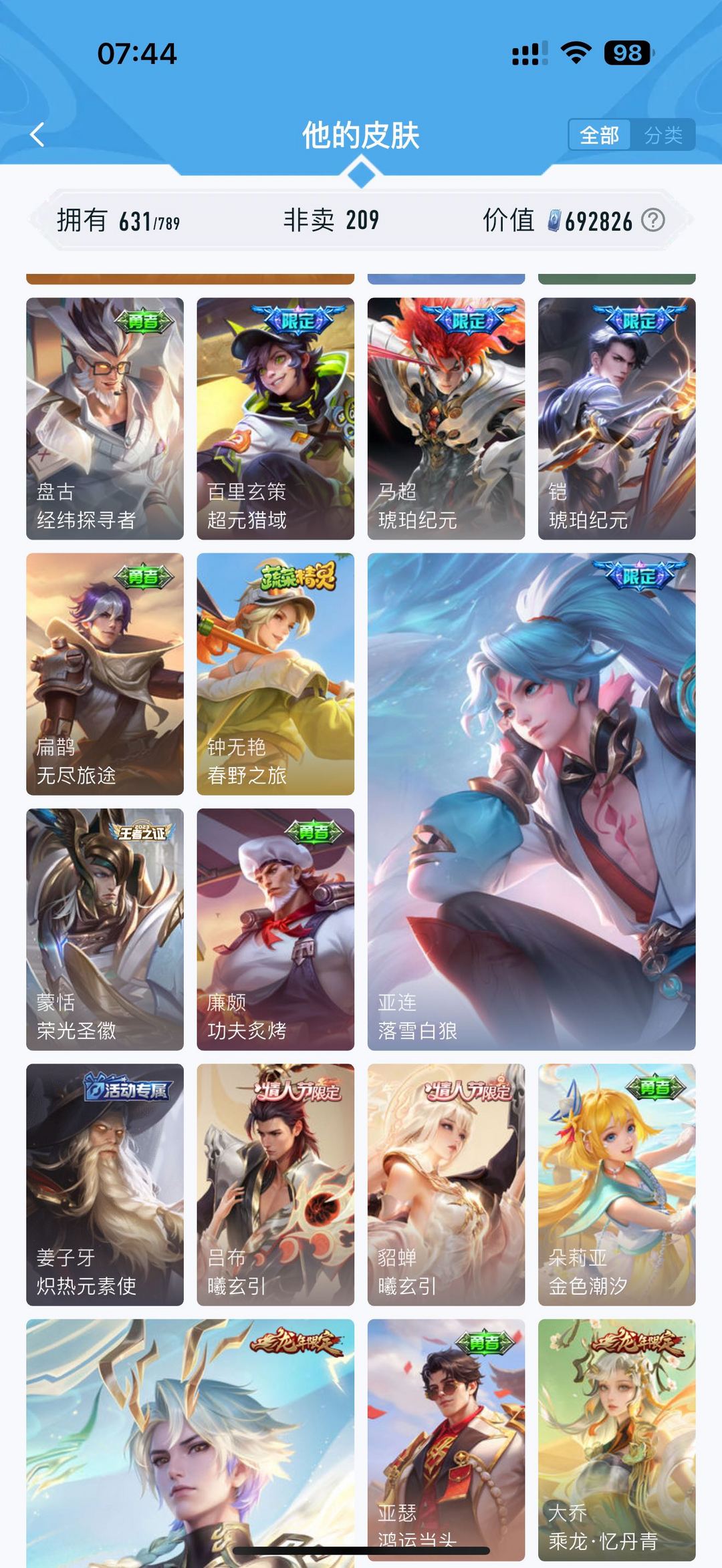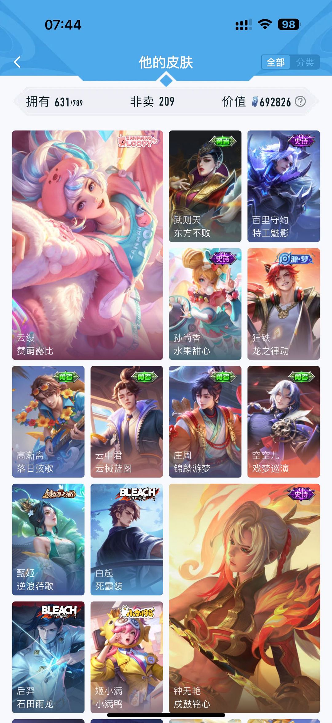 v10☆631皮肤☆9典藏☆6无双皮肤☆猴子满皮☆怪盗基德☆梅西☆九尾☆五虎五岳五圣